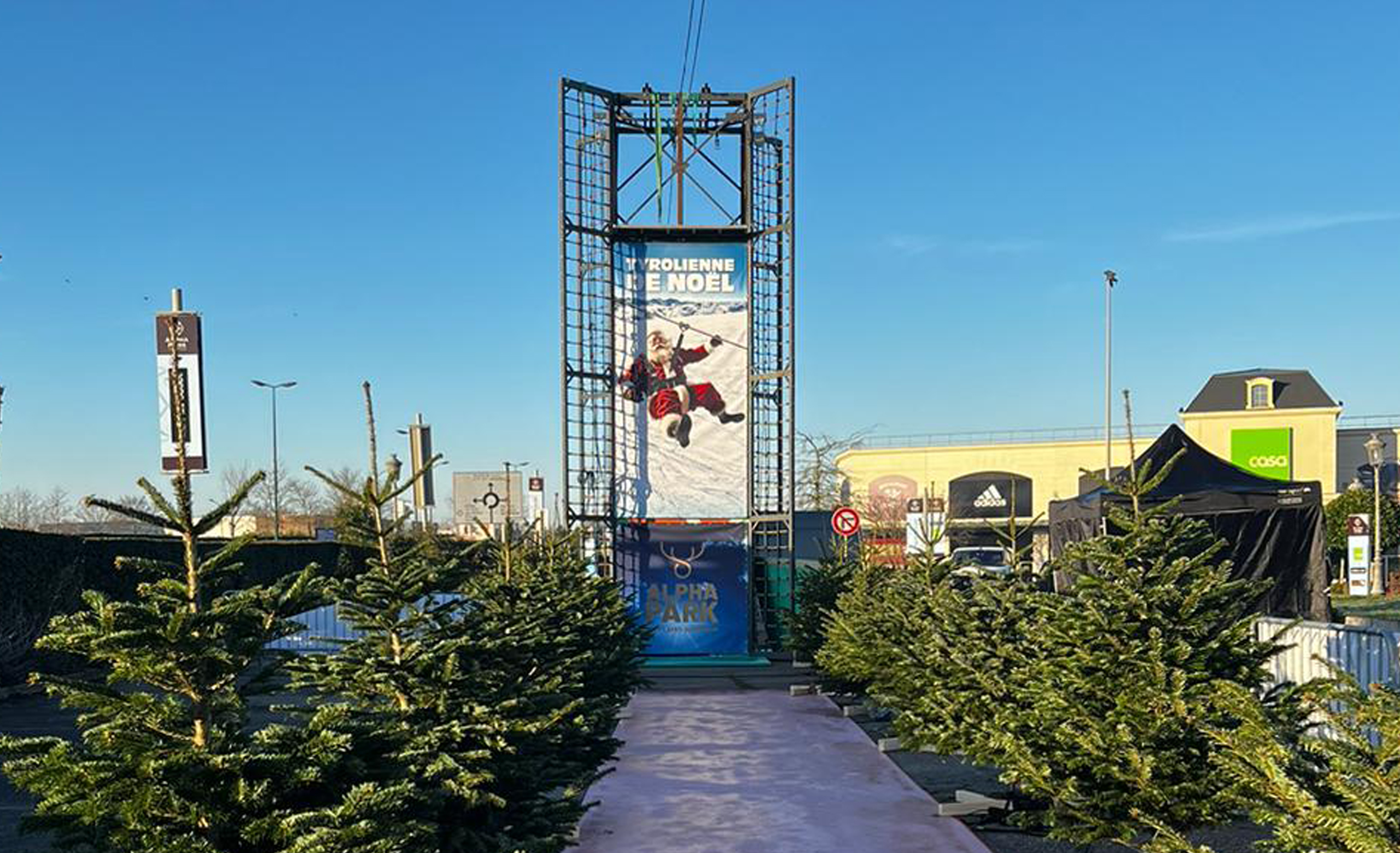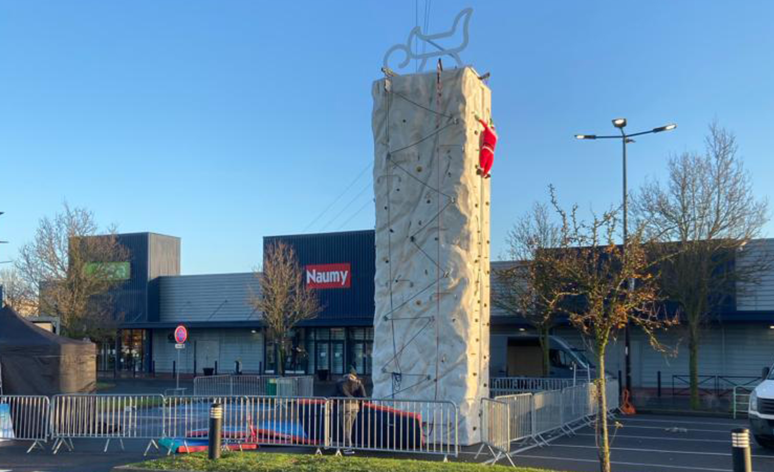 Pour les fêtes de fin d’année, transformez votre centre en un véritable parc de loisirs grâce à l’installation d’une tyrolienne. Chaque participant doit escalader un mur de 8m de haut pour atteindre la plateforme de lancement avant l’ultime plongeon.